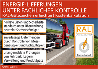 Medienberichte über schwarze Schafe unter den Händlern, die die Messgeräte an den Lieferfahrzeugen manipulieren, verstärken in manchen Fällen die Zweifel an der Kalkulationsgrundlage für Energiekosten zusätzlich. Um solche Praktiken zu unterbinden und den Skeptikern gleichzeitig die Suche nach seriösen Anbietern zu erleichtern, ist bereits vor einigen Jahren ein spezielles Qualitätsprädikat ins Leben gerufen worden: Das RAL-Gütezeichen Energiehandel zeichnet Lieferanten aus, die sich regelmäßig einer strengen und aufwändigen Überprüfung unterziehen. Dabei werden unter anderem die Zähleranlagen an den Fahrzeugen sowie die Einhaltung aller eichrechtlichen Bestimmungen von externen Sachverständigen kontrolliert. Die unangekündigten Prüftermine erstrecken sich auch auf die Lagereinrichtungen und die Verwaltungsabläufe, so dass eine Gütezeichenvergabe die Zuverlässigkeit aller Unternehmensbereiche eines Energiehändlers bestätigt. Die Kennzeichnung ist zudem ein Schutz vor minderer Produktgüte und damit vor Leistungseinbußen durch mangelhafte Verbrennungseigenschaften. Die Prüfer achten nämlich darauf, dass die chemische Zusammensetzung der Ware den gesetzlichen Normen und der Deklarierung entspricht. Weiterführende Informationen gibt es im Internet unter www.guetezeichen-energiehandel.de. Dort können die Prädikatsanbieter für jeden Standort in Deutschland nach Postleitzahlenbereich aufgelistet werden.