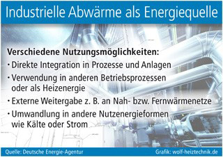 Die dena hält es unter dem Aspekt der internationalen Wettbewerbsfähigkeit wie auch als Beitrag zur Energiewende für dringend geboten, diese Effizienz-Potenziale zu heben. Die technologische Basis dafür ist vorhanden: Führende Systemanbieter wie z. B. Wolf Heiz- und Klimatechnik (Mainburg) haben gebäudetechnische Gesamtlösungen entwickelt, bei denen die Abwärmenutzung mit Hilfe zentraler Regelungskonzepte zum integralen Bestandteil des betrieblichen Energiemanagements wird. Hochwertige Wärmerückgewinnungssysteme in Klima- oder Lüftungsanlagen leisten hier beispielsweise einen bedeutenden Beitrag zur Entlastung der Wärmeerzeuger und damit zur Gesamteffizienz (www.wolf-heiztechnik.de).