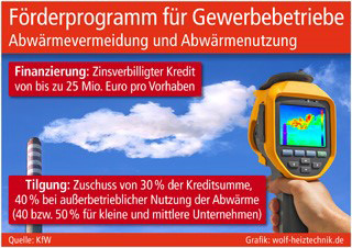 Ein thematischer Schwerpunkt in diesem Rahmen ist das Förderprogramm zur Abwärmevermeidung und Abwärmenutzung, das am 1. Mai 2016 angelaufen ist. Moderne technische Lösungen, mit denen sich bisher ungenutzte Abwärme effizient verwerten lässt, werden über die Kreditanstalt für Wiederaufbau (KfW) mit zinsverbilligten Krediten und lukrativen Tilgungszuschüssen unterstützt (www.kfw.de). Förderfähig sind z. B. die Rückführung von Abwärme in den Produktionsprozess, die Vorwärmung von anderen Medien oder die Verwendung für Heizzwecke außerhalb des Gebäudes, in dem die Wärme anfällt. Mit Krediten von bis zu 25 Mio. Euro pro Vorhaben können die förderfähigen Investitionskosten finanziert werden. Nach Durchführung der Maßnahme besteht der Zuschuss in einem Erlass von 30 Prozent der Kreditsumme. Bei einer außerbetrieblichen Nutzung der Abwärme, also z. B. der Einspeisung in Wärmenetze, können sogar 40 Prozent erlassen werden. Kleine und mittlere Unternehmen erhalten jeweils einen Bonus von weiteren zehn Prozent Tilgungszuschuss.