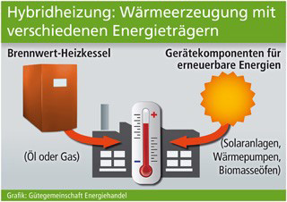 sup.- Hybrid-Heizungssysteme können auch für das Energiemanagement von Gewerbebetrieben eine zukunftweisende Option sein. Denn der Trend bei den Ausstattungen zur Wärmeerzeugung geht eindeutig in Richtung Technik-Team: Die parallele Nutzung konventioneller und erneuerbarer Energieträger durch unterschiedliche Gerätekomponenten in einer gemeinsamen Heizungsanlage gilt als wichtiger Beitrag zur Energiewende und zur Reduzierung des Brennstoffbedarfs. Eine bewährte und praxiserprobte Hybrid-Option ist beispielsweise die Kombination eines sparsamen Brennwertkessels mit einer Solaranlage. Der Heizkessel muss bei dieser Arbeitsteilung oft über mehrere Monate in der wärmeren Jahreszeit gar nicht in Aktion treten. Auch Wärmepumpen oder Biomasseöfen können in solch einem Verbund den regenerativen Anteil übernehmen und so-wohl die Schadstoff-Emissionen als auch die Betriebskosten senken. Entscheidend für den Spareffekt von Hybridsystemen ist eine zentrale, intelligente Regelung, die die einzelnen Komponenten so koordiniert, dass sie zum passenden Zeitpunkt und stets bedarfsgerecht ihre jeweiligen Vorzüge ausspielen können.