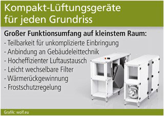 Mittlerweile muss aber auch dort nicht mehr auf ausreichenden Luftaustausch verzichtet werden, wo enge Treppen, Gänge oder Türen die Installation umfangreicher Anlagen nahezu unmöglich machen. Die aktuelle Generation von Kompakt-Lüftungsgeräten vereint einen enormen Leistungs- und Funktionsumfang auf erstaunlich kleinem Raum. So sind sie nicht nur für die Entsorgung der Abluft und die gründliche Filterung von Schadstoffen aus der Zuluft zuständig, sondern auch für eine Unterstützung der Heizungsaufgaben: Integrierte Wärmetauscher sorgen in der kälteren Jahreszeit dafür, dass die Wärme aus der verbrauchten Luft auf die frische Zuluft übertragen wird und sich dadurch der Brennstoffbedarf zum Heizen deutlich reduziert. Hocheffizienz-Geräte wie die Lüftungsanlagen des Systemspezialisten Wolf Heiz- und Klimatechnik (Mainburg) kommen dank dieser Funktion auf ein Wärmerückgewinnungspotenzial von mehr als 90 Prozent. Trotz dieser Vielfalt an Hightech-Komponenten im Inneren der Geräte warten sie mit einer besonders praktischen Montagehilfe auf: Die Anlagen in den oberen Leistungsstufen sind in der Breite teilbar, wodurch Transportmöglichkeiten und Installationskomfort deutlich optimiert werden (www.wolf.eu). Am Aufstellort werden beide Teile unkompliziert wieder zusammengefügt und sind dann bereits anschlussfähig verdrahtet für eine schnelle Inbetriebnahme.