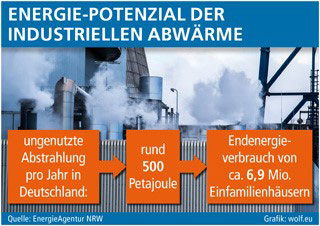 sup.- Vor allem im industriellen und gewerblichen Bereich gibt es zahlreiche Prozesse, bei denen unvermeidlich Abwärme anfällt. Als potenzielle Quellen nennt eine Studie des Wuppertal Instituts „Öfen, Wärmeabstrahlung aus Produktionsmaschinen oder -anlagen, Abwässer aus Wasch-, Färbe- oder Kühlungsprozessen, Kühlanlagen, Kühlung von Serverräumen, Motoren oder die in Produktionshallen anfallende Abluft“. Eine Vielzahl möglicher Wärmereserven also, die sich über etliche Branchen und über sämtliche Unternehmensgrößen erstreckt. Die Autoren der Studie gehen davon aus, dass diese Abwärme deutschlandweit noch immer in einer Größenordnung von jährlich rund 500 Petajoule (PJ) ungenutzt an die Umgebung abgegeben wird. Um die Dimensionen dieses Wertes zu verdeutlichen, zieht die EnergieAgentur NRW einen eindrucksvollen Vergleich: Rund 6,9 Mio. Einfamilienhäuser könnten mit der Endenergie, die der überschüssigen Abwärmemenge entspricht, komfortabel beheizt werden.