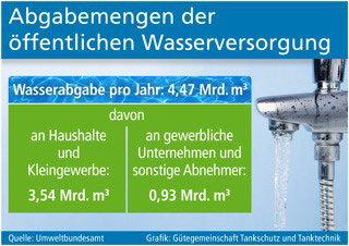sup.- Ressourcen-effizientes Wirtschaften verlangt nicht nur eine verantwortungsvolle Nutzung von Energie. Auch Wasser ist ein wertvoller Rohstoff, von dessen Verfügbarkeit die Lebensqualität der Menschen, die Landwirtschaft sowie ein Großteil der wirtschaftlichen Produktion und der Energieerzeugung abhängig sind. Vor allem aber dienen unsere Seen, Flüsse und insbesondere das Grundwasser einer wichtigen Nutzung: der Gewinnung von Trinkwasser für die öffentliche Versorgung von Privathaushalten, Gewerbebetrieben, Kindergärten, Krankenhäusern und zahlreichen weiteren Einrichtungen. Rund 4,5 Mrd. Kubikmeter Rohwasser werden dafür nach Angaben des Umweltbundesamtes jährlich den natürlichen Ressourcen entnommen und an die Verbraucher weitergeleitet. Fast 70 Prozent dieser Abgabemenge stammen aus dem Grund- und Quellwasser. Haushalte und Kleingewerbe haben mit einem Verbrauch von rund 3,5 Mrd. Kubikmetern den mit Abstand größten Anteil an der öffentlichen Wasserversorgung.