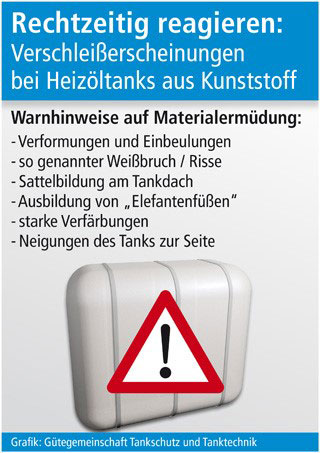Nach Angaben des Bundesverbandes Behälterschutz e. V. (Freiburg) gibt es mehrere Merkmale für eine Materialermüdung und damit für zeitnahen Handlungsbedarf. Einige dieser kritischen Verschleißerscheinungen von Kunststofftanks sind auch ohne Spezialwissen äußerlich zu erkennen. So ist die Stabilität der Anlage bedroht, wenn sich „Elefantenfüße“ bilden, also Einbuchtungen nach innen an den unteren Tankecken. Auch Verformungen, Einbeulungen, Risse oder auffällige Verfärbungen an anderen Stellen des Behälters sind Warnhinweise. Dabei muss ebenfalls auf den so genannten Weißbruch geachtet werden, der bei Kunststoffflächen meist ein Kennzeichen für Dehnung oder Biegung ist. Ein weiterer Warnhinweis ist die allmähliche Absenkung des Tankdachs. Diese „Sattelbildung“ kann die Leitungsanschlüsse für Befüllung, Entnahme und Belüftung in Mitleidenschaft ziehen. Und wenn einzelne Behälter sich zur Seite neigen oder gar gegenseitig abstützen, ist natürlich ebenfalls kein sicherer Betrieb mehr gewährleistet. Bei jedem einzelnen dieser Gefahrenhinweise ist es dringend geboten, einen nach Wasserrecht zugelassenen Tankschutz-Fachbetrieb zu kontaktieren. Ein zuverlässiges Indiz für diese Zertifizierung ist das RAL-Gütezeichen Tankschutz und Tanktechnik (www.bbs-gt.de). Die Tankschutz-Experten der mit diesem Qualitätshinweis ausgezeichneten Betriebe erkennen auch alle Mängel, die dem Betreiber verborgen bleiben. Darüber hinaus beraten sie kompetent zur Instandsetzung bzw. zur Erneuerung veralteter Tanksysteme und Sicherheitsvorrichtungen.