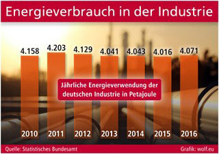 sup.- Energetische Sanierungen im industriellen Sektor sind gegenwärtig eine der wichtigsten Herausforderungen. Welche Bedeutung Maßnahmen zur Verbesserung der Energieeffizienz im verarbeitenden Gewerbe haben, belegen die jüngsten Zahlen des Statistischen Bundesamtes. Danach lag der Energieverbrauch in der deutschen Industrie mit insgesamt 4.071 Petajoule im Jahr 2016 um 1,4 Prozent über dem Vorjahr. Trotz aller bereits eingeleiteten Schritte zur Energieeinsparung stiegen dabei vor allem die Verbrauchsdaten zur rein energetischen Verwendung, also beispielsweise zur Strom- und Wärmeerzeugung. Hier kam es zu einem Plus von 4,9 Prozent. Ein Grund dafür liegt nach den Ergebnissen der jährlich durchgeführten Erhebung in der jeweils unterschiedlichen und schwankenden Intensität, mit der die einzelnen Branchen zum Klimaschutz beitragen. Während die rein energetische Nutzung beispielsweise im Maschinenbau aktuell um 17 Prozent sank, stieg sie gleichzeitig in der chemischen Industrie um 11,5 Prozent an.