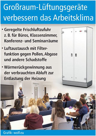 Als effiziente Lösung für einen bedarfsgerechten Luftaustausch in Betriebsgebäuden bieten sich deshalb regelbare Großraum-Lüftungsgeräte an. Bei dezentraler Aufstellung können diese Anlagen mit vergleichsweise geringem Aufwand installiert werden, weil keine Leitungen durch das Gebäude verlegt werden müssen. Die Geräte stehen direkt in den jeweiligen Aufenthaltsräumen oder in Nebenräumen. Solche Maßnahmen setzen natürlich voraus, dass bei den Lüftungsgeräten die hohen Anforderungen an Schallemissionen in Innenräumen erfüllt werden, wie dies z. B. auf die Produktpalette des Spezialisten für Heiz- und Klimasysteme Wolf zutrifft. Diese Geräte können ihre Leistung über einen CO2-Sensor stufenlos der aktuellen Luftqualität anpassen, so dass die verbrauchte Luft jederzeit bedarfsgerecht abgesaugt und nach draußen befördert wird (www.wolf.eu). Ausdünstungen von Möbeln, Teppichen, Farben oder Reinigungsmitteln, die in vielen Büros das Arbeiten erschweren, werden dabei ebenfalls zuverlässig entsorgt. Umgekehrt bilden effektive Filter in der Frischluftzufuhr ein Bollwerk gegen Pollen, Abgase und andere Schadstoffe. Auf die Energiekosten wirken zeitgemäße Großraum-Lüftungsgeräte sogar dämpfend: Eine integrierte Wärmerückgewinnung überträgt mehr als 90 Prozent der Wärme aus der Abluft auf die Zuluft und entlastet so die Heizungsanlage in der kälteren Jahreszeit erheblich.