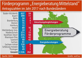 „Energiesparen lohnt sich“, so der Appell des Wirtschaftsministeriums an die Unternehmen: „Denn Energieeffizienz bedeutet für Sie: niedrigere Kosten für Strom, Wärme und Kälte, eine höhere Wettbewerbsfähigkeit und einen wichtigen Beitrag zum Klimaschutz, mit dem Sie Ihr Unternehmen zukunftsfähig und nachhaltig aufstellen.“ Über die technischen Möglichkeiten, die für diesen Beitrag heute verfügbar sind, gibt Wolf, der Spezialist für Heiz- und Klimasysteme, unter www.wolf.eu einen anschaulichen Überblick. Gerade das Effizienzpotenzial aus bedarfsgerecht konfigurierter Systemtechnik mit vernetzten Gerätekomponenten spielt in der Energieberatung eine immer wichtigere Rolle. Das Förderprogramm „Energieberatung Mittelstand“ richtet sich an Unternehmen sowie Angehörige der Freien Berufe mit Sitz und Geschäftsbetrieb in Deutschland. Als Voraussetzung für die Antragsstellung gelten eine Beschäftigtenzahl von weniger als 250 Personen sowie ein Jahresumsatz bis 50 Mio. Euro bzw. eine Jahresbilanzsumme von nicht mehr als 43 Mio. Euro. Die Höhe der Förderung hängt von den jährlichen Energiekosten des Unternehmens ab. Liegen sie oberhalb von 10.000 Euro, können 80 Prozent der förderfähigen Beratungskosten beantragt werden, maximal 6.000 Euro. Bei niedrigeren Energiekosten beträgt die Zuwendung maximal 1.200 Euro.