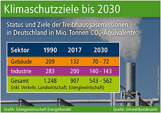 sup.- Weitgehende Treibhausgasneutralität in der zweiten Hälfte dieses Jahrhunderts: Das ist die erklärte Vorgabe des Klimaschutzplans 2050 der Bundesregierung. Wie anspruchsvoll diese Zielsetzung ist, belegt einmal mehr die aktuelle Maßnahmen-Bilanz im „Klimaschutzbericht 2018“. Danach wird der Anteil von 40 Prozent, um den die Treibhausgasemissionen bis zum Jahr 2020 im Vergleich zu 1990 nach bisheriger Planung sinken sollten, offensichtlich verfehlt. Umso wichtiger ist es, die Werte für das nächste Etappenziel 2030 zu erreichen. Statt 1.248 Mio. Tonnen CO2-Äquivalente wie 40 Jahre zuvor sollen dann in Deutschland nur noch 543 bis 562 Mio. Tonnen emittiert werden. Das entspräche einem Rückgang um insgesamt 56 bzw. 55 Prozent.