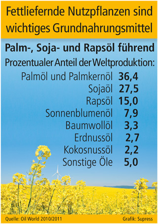 sup.- Während fettliefernde Nutzpflanzen in Europa vor allem für die Herstellung von Lebensmitteln, Kosmetika und Reinigungsprodukten sowie für die energetische Nutzung verwendet werden, sind sie in Entwicklungsländern ein wichtiges Grundnahrungsmittel. In Indonesien und Malaysia, den größten Produzenten von Palmöl, ist dieses Öl beispielsweise ein ganz maßgebliches Nahrungsmittel für die Bevölkerung und nimmt als Vitamin-A-Quelle eine herausragende Stellung ein. Darauf weist Prof. Hans Konrad Biesalski in seinem aktuellen Buch „Der verborgene Hunger“ (Springer Spektrum) hin. Die Weltproduktion fettliefernder Nutz-pflanzen in Höhe von 150,5 Mio. Tonnen (2010/2011) wird laut Angaben der Organisation Oil World angeführt von Palmöl und Palmkernöl mit einem Marktanteil von 36,4 Prozent. Dem steht hingegen ein vergleichsweise geringer Anteil von nur 5,3 Prozent an den globalen Anbauflächen für fettliefernde Nutzpflanzen gegenüber. Palmöl ist damit ein alternativlos effizienter Rohstoff. Anders sieht diese Bilanz bei den nächst bedeutenden Pflanzenölen aus: Der Marktanteil bei Sojaöl beträgt 27,5 Prozent, die dazu benötigte Anbaufläche jedoch 41 Prozent. Rapsöl mit 15 Prozent Anteil an der Weltproduktion belegt 12,9 Prozent der für fettliefernde Nutzpflanzen gebrauchten Anbauflächen.
