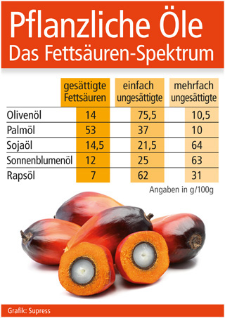 Die effizienteste fettliefernde Nutzpflanze ist die Ölpalme, da sie einen hohen Ertrag auf vergleichsweise geringer Anbaufläche bietet. Laut In-formationen der Organisation Oil World werden im Schnitt pro Hektar Fläche vier Tonnen Palmöl erzielt. Zum Vergleich: Bei Rapsöl liegt diese Quote bei 0,6 Tonnen und bei Sojaöl lediglich bei 0,4 Tonnen. Dementsprechend werden weltweit nur 5,3 Prozent der Anbauflächen für Palmöl-Plantagen benötigt, während ihr Produktionsanteil an allen fettliefernden Nutzpflanzen hier bei 36,4 Prozent liegt. Die Soja-Anbauflächen machen hingegen 41 Prozent aus bei einem weltweiten Produktionsanteil von nur 27,5 Prozent.