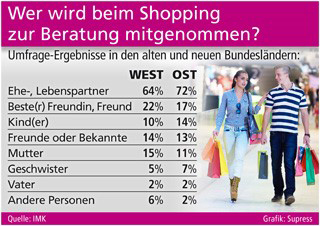 Die „West-Ost-Markenstudie 2015“ hat auch ermittelt, wer denn als Begleitperson bevorzugt wird, wenn das Shoppen in Gesellschaft erfolgt. Und hier zeigen die Umfrageergebnisse tatsächlich noch einige Abweichungen zwischen ost- und westdeutschen Kunden. Als Berater für Modeeinkäufe schätzen 72 Prozent in den neuen Bundesländern den Ehe bzw. Lebenspartner. In Westdeutschland trifft das nur auf 64 Prozent der Käufer zu. Dafür stehen im Westen beste Freunde oder Freundinnen als Shopping-Begleitung mit 22 Prozent der Nennungen höher im Kurs als im Osten (17 Prozent). Auf Platz drei der beliebtesten Ratgeber kommt in den alten Bundesländern mit 15 Prozent die eigene Mutter, obwohl die Umfrage-Zielgruppe ausschließlich Erwachsene ab 18 Jahre umfasste. In ostdeutschen Modegeschäften ist die Meinung der Mutter für 11 Prozent der Kunden relevant. Dem Vater trauen unabhängig von der Region allerdings nur zwei Prozent eine kompetente Beratung in Stilfragen zu.