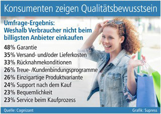 Dieses Qualitätsbewusstsein verdeutlichen unter anderem die vielfältigen Erwartungen, die nach Angaben der befragten Konsumenten jeweils gegen die Wahl des billigsten Anbieters sprechen: So sind 48 Prozent von ihnen bereit, für ein Produkt oder eine Dienstleistung mit echter Garantie mehr Geld auszugeben. Für immerhin 35 Prozent sind die Versand- und Lieferkosten einen Zuschlag wert und 33 Prozent akzeptieren dies bei kundenfreundlichen Rücknahmekonditionen. Rund ein Viertel aller Befragten nennen jeweils Treue- oder Kundenbindungsprogramme, eine einzigartige Produktvariante oder die Unterstützung nach dem Kauf als ausreichenden Grund für einen höheren Preis.