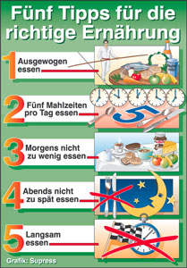 1. Ausgewogen essen: Die tägliche Kost sollte alle wichtigen Nährstoffe in den richtigen Mengen enthalten. Die ideale Verteilung: 50 Prozent Kohlenhydrate, 35 Prozent Fett, 15 Prozent Eiweiß.