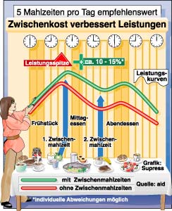 sup.- Ob wir uns am späteren Vormittag noch konzentrieren können oder nachmittags noch körperlich fit sind, hängt ganz wesentlich von unserer Ernährung ab. Wichtig ist vor allem eine gleichbleibend gute Nährstoffversorgung. Deshalb sollten statt der üblichen drei Hauptmahlzeiten am Morgen, Mittag und Abend täglich fünf Essenszeiten eingeplant werden. Nach Angaben des Auswertungs- und Informationsdienstes für Ernährung, Landwirtschaft und Forsten (aid), Bonn, sorgen die beiden zusätzlichen Zwischenmahlzeiten am Vor- und Nachmittag für eine deutliche Anhebung der Leistungskurve - Tag für Tag. Bei der Leistungsspitze um ca. 11 Uhr können sogar Steigerungen von zehn bis 15 Prozent erreicht werden. Natürlich kommt es aber nicht nur auf die Anzahl, sondern auch auf die Zusammensetzung der Mahlzeiten an. Eine Grundregel lautet hier: Jede Kost sollte alle wichtigen Nährstoffe, Vitamine sowie Mineralien in ausgewogenen Mengen enthalten. Und auch auf den Umfang der Nahrungsaufnahme ist zu achten. So ist es empfehlenswert, mit dem Frühstück rund 25 Prozent der gesamten täglichen Nährstoffmenge zu sich zu nehmen. Das Mittagessen sollte ca. 30 Prozent, das Abendessen etwa 25 Prozent und die beiden Zwischenmahlzeiten jeweils zehn Prozent liefern.