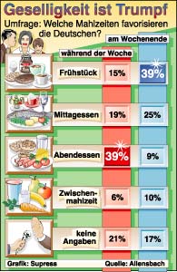 sup.- Welche Mahlzeit ist für die Deutschen am wichtigsten? Dieser Frage ist eine repräsentative Studie des Instituts für Demoskopie Allensbach nachgegangen. Das Ergebnis: An den Wochentagen wird von den Bundesbürgern vor allem das Abendessen geschätzt. Für 39 Prozent der Deutschen hat diese Mahlzeit den größten Stellenwert, vor allem weil dann oft gemeinsam im Kreis der Familie bzw. mit dem Partner gegessen wird. Auf der Favoritenskala folgen Mittagessen, Frühstück sowie Zwischenmahlzeiten.