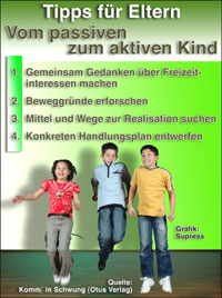 sup.- Fernseher, PC und Spielkonsolen verführen viele Kinder zu einer sehr passiven Freizeitgestaltung. Die Folgen sind unübersehbar: 40 Prozent der Schulanfänger sind mittlerweile übergewichtig, fünf Prozent von ihnen leiden bereits unter krankhafter Fettsucht. Und 80 Prozent der Kinder, die im Alter von zehn bis 13 Jahren übergewichtig sind, bleiben dies ein Leben lang. Aber was können Eltern tun, um im Zeitalter der elektronischen Medien ihre Kinder zu einem aktiven Lebensstil zu motivieren? „Sie sollten gemeinsam mit ihrem Kind Veränderungen herbeiführen und die Selbstbestimmung ihres Kindes unterstützen“, rät der Entwicklungspsychologe Prof. Rainer K. Silbereisen (Friedrich-Schiller-Universität Jena) und einer der neun Autoren des Praxisbuches „Komm’ in Schwung – Der kluge Alltags-Plan für fitte Kinder“ (Otus Verlag, 9,95 Euro).