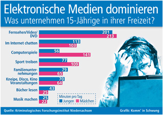 sup.- Die beliebtesten Freizeitbeschäftigungen der heutigen Jugend haben vor allem ein Merkmal gemeinsam: Sie geschehen passiv im Sitzen, bewegt werden maximal die Finger. Im täglichen Durchschnitt, das Wochenende ist hier anteilig mitgerechnet, schauen Jugendliche mehr als 200 Minuten Fernsehen, Video oder DVD. Statt sich mit Freunden zu treffen, wird vielfach das Chatten im Internet bevorzugt – im Schnitt geschieht dies über 100 Minuten am Tag. Noch wichtiger als die virtuelle Korrespondenz sind für Jungs Computerspiele. Zwei Stunden und 21 Minuten nehmen die elektronischen Spiele in Anspruch, bei den Mädchen ist diese Vorliebe mit knapp einer Stunde deutlich geringer ausgeprägt. Zu diesen Ergebnissen kommt eine Befragung des Kriminologischen Forschungsinstituts Niedersachsen bei über 44.000 Schülerinnen und Schülern der Klasse neun, die im Schnitt 15 Jahre alt sind.