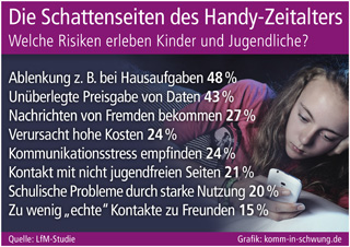 Zu den positiven Aspekten der Mobiltelefone zählen Eltern wie ihr Nachwuchs gleichermaßen die Erleichterung der Kommunikation und Alltagsorganisation sowie die Erreichbarkeit in Notsituationen. Neben der Kommunikation wird das Handy von Kindern und Jugendlichen vielfach aber auch als Unterhaltungsmedium, z. B. zum Spielen oder Musikhören genutzt. Und es birgt auch zahlreiche Gefahren, insbesondere bei intensiver Nutzung, die zu erheblichen Problemen im Alltag führen können. Zu den von den Kindern und Jugendlichen selbst erlebten Risiken gehört laut der LfM-Studie vor allem das hohe Ablenkungspotenzial von Handys und Smartphones beispielsweise bei dem Erledigen von Hausaufgaben, das von 48 Prozent der Befragten genannt wurde. Mit rund 24 Prozent bestätigt zudem nahezu jeder vierte jugendliche Nutzer von Mobiltelefonen, dass er durch die ständige Online-Präsenz Kommunikationsstress empfindet. Und 15 Prozent bedauern, dass durch die Allgegenwart von Smartphones & Co. „echte“ Kontakte mit Freunden zu kurz kommen.