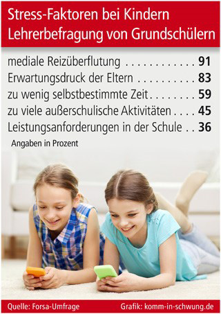 Schon Kinder fühlen sich zunehmend gestresst. Zu diesem Ergebnis kommt eine repräsentative Forsa-Umfrage im Auftrag der DAK-Gesundheit, bei der 500 Lehrerinnen und Lehrer der Klassenstufen 1 bis 6 interviewt worden sind. 31 Prozent der Lehrer bestätigen, dass die Stressbelastung der Schüler in den letzten zehn Jahren stark zugenommen hat. Dass sich der Druck zumindest etwas er-höht hat, sagen weitere 55 Prozent der Befragten. Nur zwölf Prozent der Lehrer sehen in dieser Hinsicht keine Veränderung, magere zwei Prozent vermuten eine Abnahme von Stress.