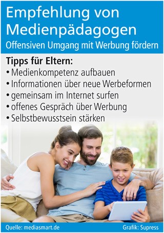 sup.- Werbung findet nicht im luftleeren Raum statt. Werbung ist in Deutschland für alle Werbeträger wie Fernsehen, Hörfunk, Kino, Internet, Printmedien oder Plakate durch eine Vielzahl von Gesetzen und Verordnungen detailliert geregelt. So ist zum Beispiel jede irreführende Werbung verboten. Verbraucher haben dennoch die Möglichkeit, sich an den Werberat zu wenden, wenn sie den Eindruck haben, dass eine Werbung gegen diese Vorschriften verstößt. Diese Reglementierungen sind Medienpädagogen zufolge ausreichend, auch im Hinblick auf Werbung für Kinderprodukte, für die ohnehin zusätzliche Auflagen gelten. Statt weitere Verbote zu fordern, ist es ihrer Ansicht nach mit Abstand sinnvoller, wenn Eltern und Erzieher schon früh einen offensiven Umgang mit Werbung fördern. Diese Zielsetzung unterstützt die 2004 gegründete medienpädagogische Initiative Media Smart (www.mediasmart.de) u. a. mit dem kostenlosen Angebot von entsprechenden Lernmaterialien für Kindergärten und Grundschulen. „Wir wollen, dass Kinder im Rahmen von Medienkompetenz sich auch selbstbestimmt und kompetent mit Werbung auseinandersetzen können und lernen, diese zu durchschauen“, erläutert Prof. Stefan Aufenanger (Universität Mainz) in seiner Funktion als Media Smart-Beiratsmitglied.