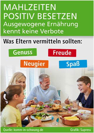 Wenn der Nachwuchs in angenehmer, entspannter Atmosphäre aus einem vielseitigen Angebot wählen kann, schaffen Eltern damit beste Voraussetzungen für die Entwicklung eines gesunden Ernährungsverhaltens. Ermahnungen oder gar Gesundheitsvorträge im Zusammenhang mit Mahlzeiten wirken sich hingegen eher kontraproduktiv aus. Stattdessen sollten Eltern vorleben, dass Essen und Trinken sehr viel auch mit Genießen-Können zu tun haben, dazu gehört z. B. auch das Ausprobieren von neuen Geschmackserlebnissen. „Genuss ist ein elementarer Bestandteil der Selbstfürsorge und trägt zur seelischen Balance bei“, betont der Psychologe Dr. Rainer Lutz (Philipps-Universität Marburg), der sich als Experte z. B. für die Portale genuss-tut-gut.de sowie komm-in-schwung.de engagiert.