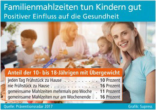 Damit bestätigt der Präventionsradar die Erkenntnisse früherer Studien, die bereits gezeigt haben, dass Kinder, die die Morgenmahlzeit wahrnehmen, sich insgesamt mehr bewegen und seltener zu Übergewicht neigen als Frühstücksmuffel. Auch der allgemein positive Einfluss von gemeinsam eingenommenen Mahlzeiten wird unterstrichen. Sie bieten gute Voraussetzungen, um die Ernährungsgewohnheiten der Sprösslinge zu prägen und ihnen auch die wichtige Fähigkeit zum Genießen zu vermitteln.