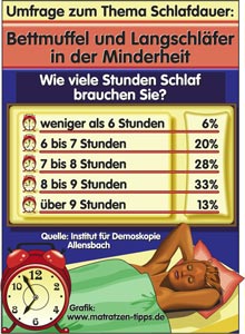 Nur rund sechs Prozent der Befragten kommen laut Allensbach nach eigener Einschätzung mit weniger als sechs Stunden Schlaf aus, etwa 13 Prozent beziffern ihren nächtlichen Ruhebedarf auf mehr als neun Stunden. Die überwiegende Mehrheit ordnet ihr notwendiges Schlafpensum in den Zeitrahmen ein, den auch viele Experten und Schlafforscher für ein gesundes Mittelmaß halten: von sechs bis sieben Stunden (20 Prozent), von sieben bis acht Stunden (28 Prozent) und von acht bis neun Stunden (33 Prozent).