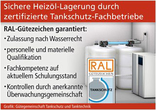 Zur Umsetzung dieser Betreiberpflichten gibt es seit mehr als 50 Jahren eine wertvolle Hilfestellung: Die Gütegemeinschaft Tankschutz und Tanktechnik e. V. ist eine baurechtlich anerkannte Überwachungsgemeinschaft, die die Qualifikation der Tankschutz-Fachbetriebe in Deutschland kontrolliert. Bei diesem Verfahren wird nach Prüfkriterien, die über die Gesetzeslage hinausgehen, die Kompetenz der Betriebe für Installations-, Wartungs- oder Instandsetzungsarbeiten unter die Lupe genommen. Nur bei nachgewiesener Zuverlässigkeit darf ein Betrieb das RAL-Gütezeichen Tankschutz und Tanktechnik führen. Dem Hausbesitzer gibt das Prädikat die Sicherheit, dass er einen Fachbetrieb mit der Zulassung nach Wasserrecht beauftragt. Diese Zertifizierung ist gesetzlich vorgeschrieben, damit der Tankbetreiber die Verantwortung für den Gewässerschutz delegieren darf. Unter www.bbs-gt.de lassen sich die zugelassenen Anbieter von Tankschutz-Maßnahmen nach Postleitzahlenbereichen auflisten. Jeder Öltank-Besitzer kann so einen Fachbetrieb mit RAL-Gütezeichen in seiner Region finden.