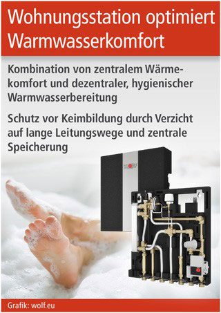 Auf lange Verteilungsleitungen für erwärmtes Brauchwasser kann bei dieser Lösung ebenso verzichtet werden wie auf einen großen Warmwasserspeicher am Heizkessel. Damit ermöglichen Wohnungsstationen besonders in Mehrfamilien- und Wohnhochhäusern eine äußerst sichere und hygienische Form der Warmwasserbereitung. Der Verzicht auf zentrale Speicherung und Verteilwege durchs ganze Haus mindert nämlich nicht nur die Energieverluste durch Auskühlung, sondern auch das Risiko einer Keimbildung in den Leitungen. Auch in Gebäuden mit zahlreichen und weit voneinander entfernt liegenden Wohneinheiten müssen aufgrund dieser dezentralen Wärmeabgabe keine Kompromisse bei der Trinkwasserhygiene gemacht werden. Der Warmwasserkomfort lässt sich sogar optimieren: Zeitgemäße Wohnungsstationen wie die Anlagen des Systemspezialisten Wolf Heiz- und Klimatechnik (Mainburg) können mögliche Schwankungen in der Vorlauftemperatur ausgleichen: Die integrierte „RatioFlow-Funktion“ sorgt dann konstant für eine thermostatische Nachregelung (www.wolf.eu), so dass der Nutzer beispielsweise unter der Dusche von den Schwankungen nichts mitbekommt. Das wärmegedämmte Gehäuse dieser Geräte ist ein weiterer Schutz vor Energieverlusten und trägt ebenfalls zur Effizienz des gesamten Heizungssystems bei.