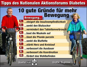 Eine der wesentlichen Aufgaben des NAFDM, das vom Bundesministerium für Gesundheit gefördert wird, ist es, die Bundesbürger zu mehr körperlicher Aktivität zu motivieren. Dabei geht es nicht um sportliche Höchstleistungen, sondern um regelmäßige, moderate Bewegung wie wandern, walken, joggen, Radfahren, skaten, schwimmen, tanzen oder einen langen Spaziergang machen. Gründe für mehr Bewegung gibt es etliche (siehe Tabelle). Sie reichen von der Verbesserung des Stoffwechsels über das Purzeln von Pfunden bis hin zur Förderung des allgemeinen Wohlbefindens. Aber von der festen Absicht, die Aktivitätsbilanz dauerhaft zu erhöhen, bis zur kontinuierlichen Umsetzung stört der täglich zu überwindende innere Schweinehund. Hier einige Tipps des NAFDM, wie dieser Kamerad ausgetrickst werden kann: