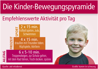 Die Basis der Pyramide bilden alltägliche Aktivitäten wie Treppensteigen, zur Schule gehen oder mit dem Rad fahren und das Mithelfen im Haushalt. Sie strengen die meisten Kinder nur leicht körperlich an. Empfohlen werden hier sechs Einheiten pro Tag von mindestens fünf Minuten Länge. In ihrer Freizeit sollten Kinder wenigstens viermal am Tag für 15 Minuten mittelmäßig anstrengende Aktivitäten wie draußen mit Freunden toben, Fangspiele, Verstecken spielen, klettern oder Hüpfspiele unternehmen. Richtig auspowern mit Sport sollte zweimal am Tag für mindestens 15 Minuten eingeplant werden. Tipps und Anregungen, wie Eltern bei schlechtem Wetter auch dem jeweiligen Alter ihres Nachwuchses angepasste Bewegungseinheiten zuhause einführen können, gibt es z. B. auf www.komm-in-schwung.de. Dieses Internetportal wird u. a. von der Plattform für Ernährung und Bewegung (peb) empfohlen.