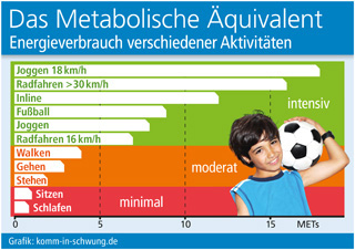 Das Metabolische Äquivalent (MET), mit dem der Energieverbrauch verschiedener Aktivitäten verglichen wird, ist bei sitzenden Tätigkeiten fast genauso gering wie beim Schlafen (siehe Grafik). Laut der HELENA-Studie verbringen europäische Jugendliche im Schnitt 70 Prozent ihrer Wachzeit im sitzenden Zustand. Früher wurde das lange Hocken in der Schule durch körperlich aktives Freizeitverhalten ausgeglichen. Das ist heute weitestgehend nicht mehr der Fall. Stattdessen sitzen Kinder und Jugendliche täglich oft stundenlang vor Bildschirmen, z. B. um zu chatten, virtuell zu spielen oder fernzusehen. Diese Sitzzeiten müssen von den Eltern deutlich reduziert werden, außerdem sollte das Sitzen möglichst alle fünf Minuten unterbrochen werden. Das ist leichter gesagt als getan. Aber auch im IT-Zeitalter gilt immer noch: Kindern, denen bereits in jungen Jahren Freude an Bewegung vermittelt wurde, und in dieser Hinsicht haben Eltern natürlich eine wichtige Vorbildfunktion, sind meist lebenslang eher für einen körperlich aktiven Alltag zu begeistern als diejenigen, denen dieser Lebensstil nicht vorgelebt worden ist. Tipps und Anregungen, wie Eltern diese Einstellung bei ihrem Nachwuchs fördern können, gibt z. B. das Ratgeber-Portal www.komm-in-schwung.de.