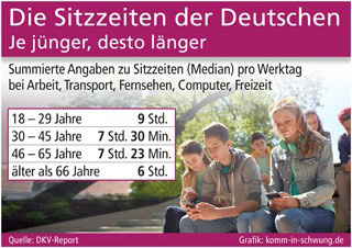 Der repräsentativen Umfrage zufolge gehört stundenlanges Sitzen bei der Arbeit, auf dem Weg dorthin sowie in der Freizeit heute zum Alltag der meisten Deutschen. Im Schnitt verbringt jeder Bundesbürger etwa 7,5 Stunden pro Tag im Sitzen. Auffällig ist dabei: Die Auswertung nach Altersgruppen offenbart, dass die Sitzzeiten der 18- bis 29-Jährigen mit einem medianen Durchschnittswert von neun Stunden mit Abstand am höchsten sind. Die Detail-Analyse ergibt, dass bei jungen Erwachsenen im Vergleich zu allen anderen Altersgruppen die Sitzzeiten für den Transport, bei der Arbeit sowie bei der Computer-Nutzung in der Freizeit am längsten sind. Lediglich in den Bereichen des Fernsehens und der sonstigen Freizeit kommen Senioren, bei denen Sitzzeiten während der Arbeit entfallen, auf höhere Sitzzeiten.