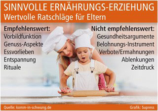 Ohnehin sollten Eltern sich vergegenwärtigen, dass Gesundheitsargumente bei der Ernährungs-Erziehung nicht unbedingt zielführend sind. Vor allem kleinere Kinder verknüpfen dann schnell mit dem Attribut gesund die Vorstellung, schmeckt nicht und umgekehrt mit ungesund, ist lecker. Hinzu kommt: Auch unter ernährungswissenschaftlichen Gesichtspunkten ist eine Einteilung von Lebensmitteln in gesund bzw. ungesund nicht sinnvoll. Entscheidend für eine erstrebenswerte ausgewogene Ernährung ist die Gesamtauswahl der Nahrungsmittel und nicht einzelne Produkte. Psychologen raten zudem davon ab, die Ernährung als pädagogisches Instrument im Spannungsfeld von Strafen oder Belohnungen zu nutzen. Solche Maßnahmen sind kontraproduktiv und können sogar Ess-Störungen begünstigen. Auch Streitgespräche während der Mahlzeiten, Zeitdruck oder Ablenkungen z. B. durch Handys sollten nach Möglichkeit vermieden werden. Generell gilt: Umso positiver Eltern die Ernährung für ihre Kinder gestalten, indem sie Freude, Spaß und Genuss in den Vordergrund stellen, desto geringer ist die Wahrscheinlichkeit, dass der Nachwuchs ein negatives, ungesundes Verhältnis zum Essen entwickelt.