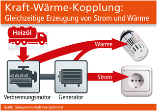 Das Konzept hinter dieser Technologie ist leicht nachvollziehbar: Wo Strom produziert wird, entsteht als Begleitprodukt auch Wärme. Geschieht dies jedoch irgendwo in einem Großkraftwerk, kommt es dort meistens zu einer Wärmeabgabe an die Umwelt ohne sinnvolle Verwertung. Warum also holt man nicht die Stromerzeugung direkt ins jeweilige Gebäude und nutzt die entstehende Wärme vor Ort zum Heizen? Genau dies ist die Aufgabe von so genannten Mini-Blockheizkraftwerken. Hier treibt ein Verbrennungsmotor einen Generator an, der Strom für die Eigennutzung oder für die Netzeinspeisung erzeugt. Sowohl Motor als auch Generator geben Wärme ab, die dann praktisch verlustfrei in die Heizungsanlage gespeist wird. Wenn bisher bereits Heizöl für die Wärmeversorgung des Gebäudes genutzt wurde, muss an diesem Energieträger bei einer KWK-Lösung nichts geändert werden. Mini-Blockheizkraftwerke, in denen ein ölbetriebener Verbrennungsmotor seine Arbeit verrichtet, haben sich längst in vielen Betriebstätten bewährt.