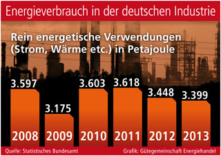 sup.- Der Energieverbrauch der deutschen Industrie lag nach aktuellen Berechnungen des Statistischen Bundesamtes im Jahr 2013 bei 4.056 Petajoule. Das entspricht rund 1.127 Terawattstunden. Zieht man von der Gesamtmenge die Summe der Energieträger ab, die als Ausgangsstoff für chemische Produkte genutzt wurden, bleiben 3.399 Petajoule für rein energetische Verwendungen, also beispielsweise für die Strom- und Wärmeerzeugung. Dieser Wert schwankt im Vergleich der letzten Jahre und lässt noch keine eindeutige Tendenz zum Rückgang erkennen. Für den um zumindest 5,5 Prozent reduzierten energetischen Verbrauch gegenüber 2008 machen Experten nur bedingt eine höhere Effizienz beim Einsatz im verarbeitenden Gewerbe verantwortlich. Milde Winter und eine schwierige Auftragslage z. B. in der Metallindustrie hatten einen wesentlich größeren Einfluss auf den Energiebedarf. Noch geben die Werte also keinen Anlass zur Entwarnung, zumal sich die Preise für Energie in diesem Zeitraum überwiegend nach oben entwickelt haben.