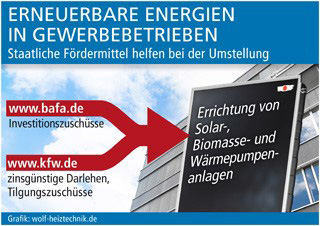 sup.- Solarkollektoren auf dem Bürogebäude, Wärmepumpen für den Produktionsstandort, Biomasseanlagen zur Beheizung eines Handwerks- oder Gastronomiebetriebs – es gibt heute für jede gewerbliche Einsatzvariante ausgereifte Technik zur Einbindung erneuerbarer Energien. Sonnenstrahlung, Umgebungswärme und Holz bzw. andere biogene Energieträger mindern die Betriebskosten, senken die Abhängigkeit von fossilen Brennstoffen und sorgen gleichzeitig für die Reduzierung klimaschädlicher CO2-Emissionen. Dass diese Einspar-Option noch immer in vielen Betrieben ungenutzt bleibt, liegt häufig an fehlenden Informationen über die Effizienz-Vorteile einer Sanierung bzw. an Bedenken hinsichtlich der Investitionskosten. Die Bundesregierung fördert deshalb mit dem so genannten Marktanreizprogramm (MAP) die Umstellung auf erneuerbare Energien bei der Wärmeerzeugung. Sowohl Privatpersonen als auch Unternehmen und Kommunen können bei der Installation von Solar-, Biomasse- und Wärmepumpenanlagen unterstützt werden. Insgesamt 300 Mio. Euro jährlich stehen für diese Programme bereit.