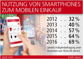 sup.- Vor ein paar Jahren war es noch das Hobby einiger Technik-Pioniere, dann wurde es zum Trend und mittlerweile ist es für die Meisten eine Selbstverständlichkeit: Knapp 70 Prozent aller Deutschen zwischen 18 und 69 Jahren nutzen ihr Smartphone oder Tablet, um damit völlig ortsunabhängig einzukaufen. Das hat eine aktuelle Umfrage des Bundesverbandes E-Commerce und Versandhandel Deutschland e. V. (bevh) ergeben. Danach hat sich die Quote der Mobil-Einkäufer von 32 Pro-zent im Jahr 2012 bis heute mehr als verdoppelt. Die Frühjahrs-umfrage 2016 hat zudem gezeigt, dass die Bezahlung dieser Käufe über so genannte Mobile-Payment-Dienstleister inzwi-chen ebenfalls stark an Akzeptanz gewonnen hat. Mit einem Anteil von 51 Prozent hat diese Option die traditionellen Zahl-weisen wie Rechnung oder Kreditkarte bzw. die Zahlung über den eigenen Netzanbieter längst überrundet.